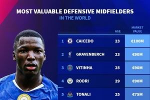 体育资讯11月2日讯 德国转会市场列出了防守型中场身价排名,凯塞多以1亿欧居首。